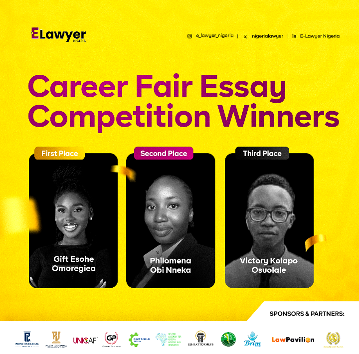 The results are in, and the E-Lawyer Nigeria Career Fair Essay Competition has crowned its top writers for 2024! This year’s competition encouraged law students nationwide to reflect on the future of legal practice, inspiring remarkable essays that displayed fresh perspectives, insightful ideas, and innovative solutions for modern legal challenges. E-Lawyer Nigeria is excited to celebrate the outstanding achievements of the following students: