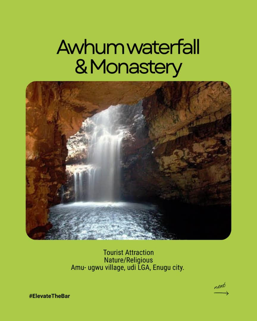 This hidden gem is one of the most enchanting spots in Enugu. The Awhum Waterfall flows down from a massive outcrop of granite rock, creating a serene and almost spiritual atmosphere. Right beside it is the Awhum Monastery, a place where Catholic monks live in quiet devotion. Visitors often come here for prayer retreats, meditation, and of course, sightseeing.